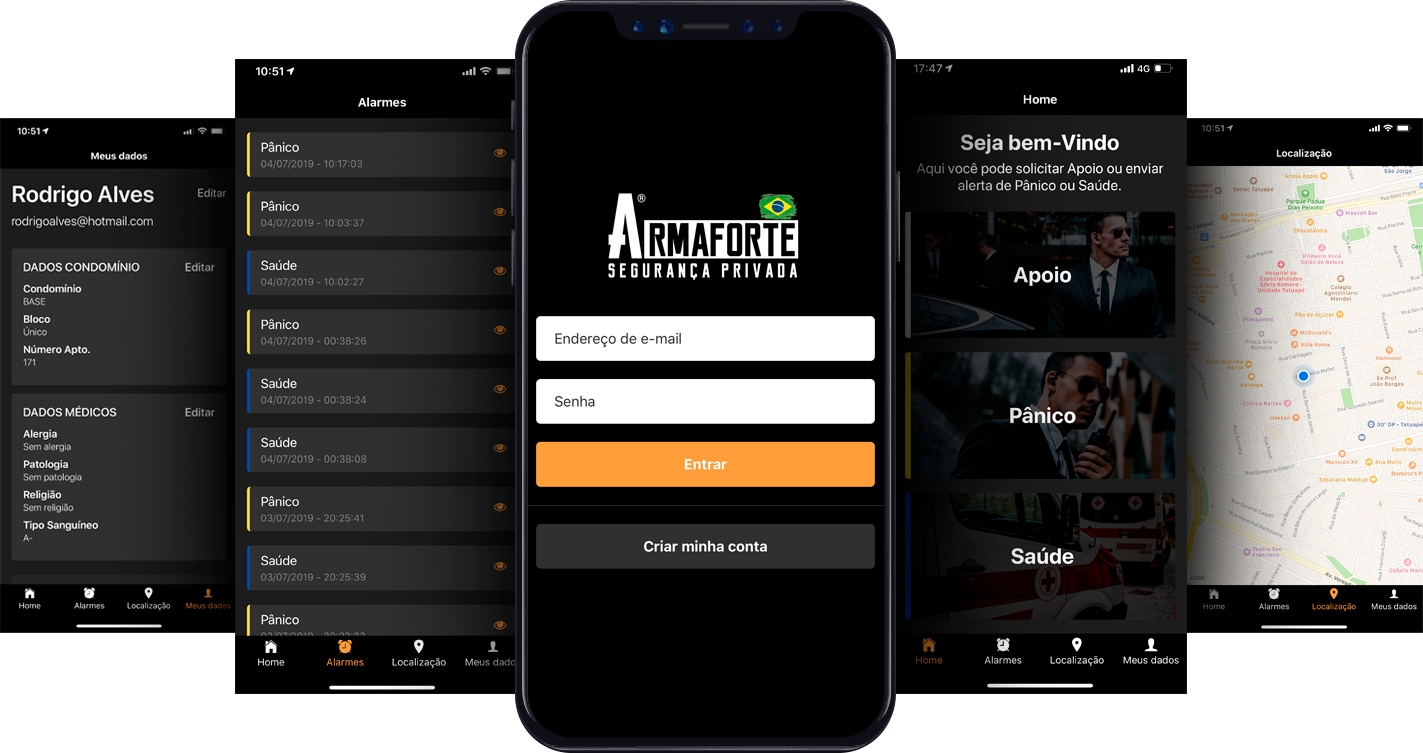O aplicativo ArmaForte serve para que você esteja sempre protegido e seguro em qualquer local ou período, independente da ocorrência. Com ele você conta com nossos principais serviços, tais como Escolta, seja de bens ou valores, Botão do Pânico e questão de Saúde.